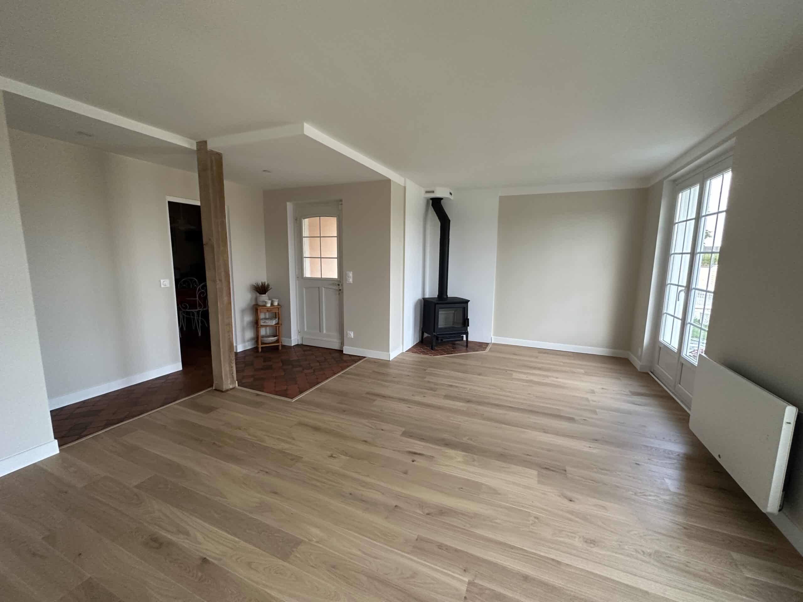 À Épône, cet espace de vie a été entièrement repensé pour offrir un intérieur moderne et fonctionnel. Le réseau Aximotravo est intervenu sur une rénovation technique comprenant la dépose d’un conduit de cheminée et la mise en place d’un nouveau système de fumisterie. Des solutions de confort thermique ont été intégrées, accompagnées de finitions soignées comme la pose d’un parquet en chêne. Une rénovation axée sur le confort et la durabilité.